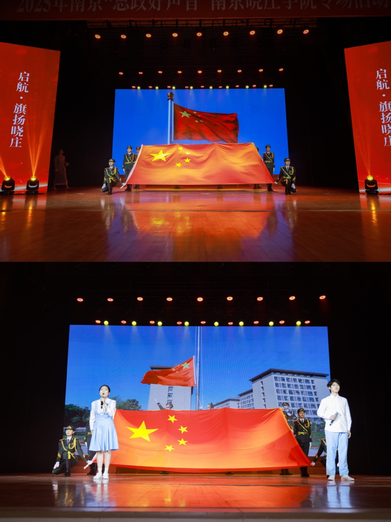 序章以南京“思政好声音”回顾短视频拉开帷幕。当南京晓庄学院国旗护卫队现场展示北京天安门地区管委会赠予学校的国旗,全场响起热烈的掌声。晓庄学子演绎的原创诗朗诵《国旗下的晓庄》,展示了晓庄师生在国旗下的成长与奋斗和对祖国的忠诚与热爱。