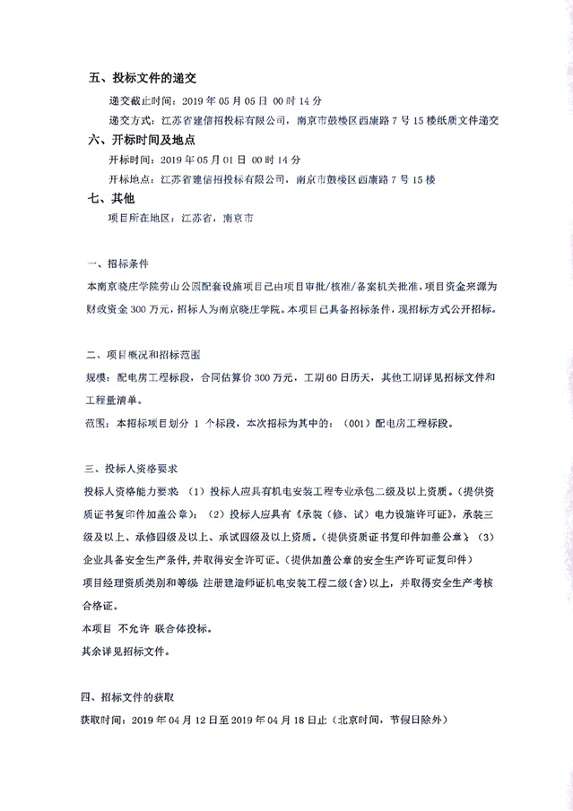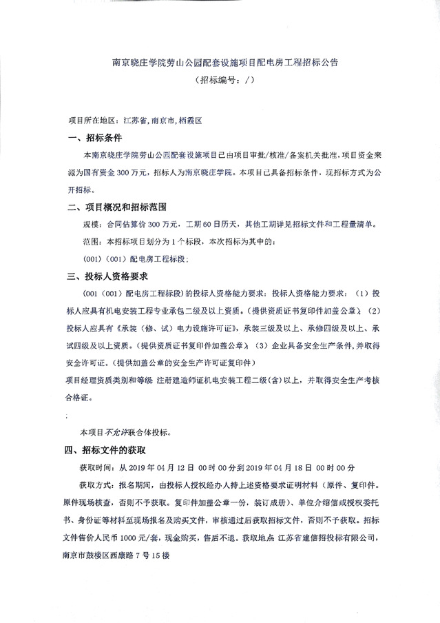 南京晓庄学院劳山公园配套设施项目配电房工程招标公告