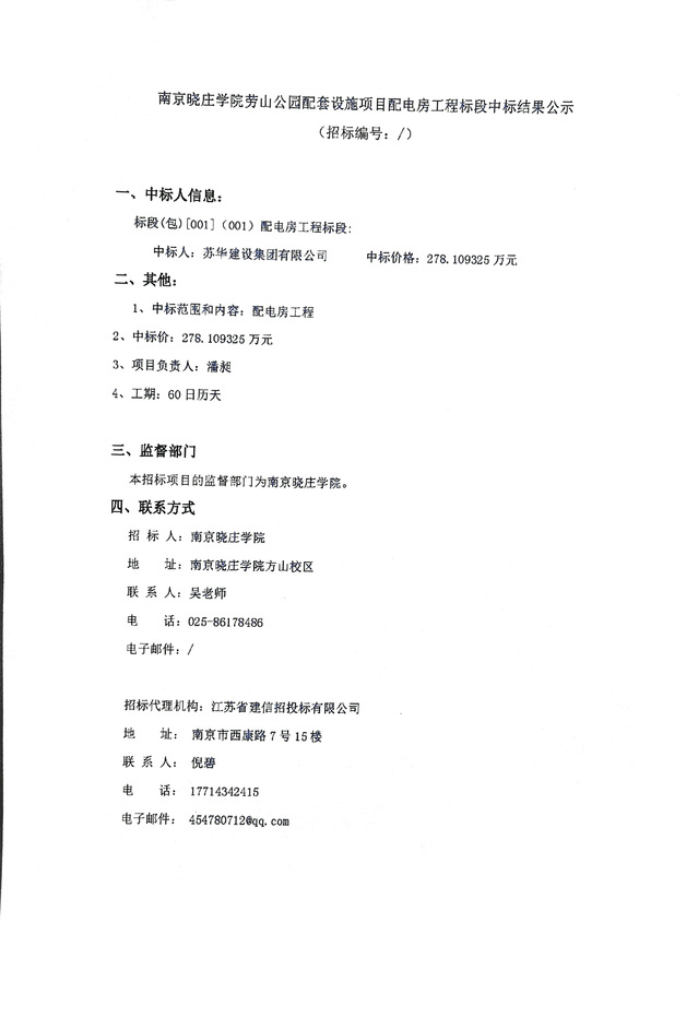 南京晓庄学院劳山公园配套设施项目配电房工程标段中标结果公示