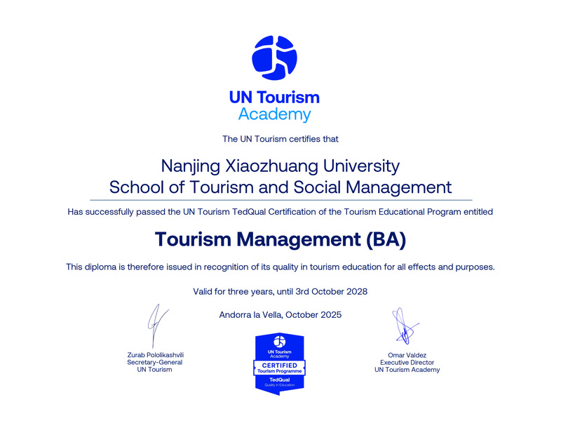 近日,南京晓庄学院旅游与社会管理学院旅游管理(BA)专业高质量通过联合国旅游组织教育质量认证(UN Tourism TedQual Certification),认证成绩优异,并在首次认证中即斩获三年认证期。这一成果是对学校专业建设水平与教育质量的权威认可与高度肯定。