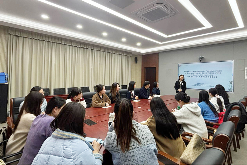 程贺南的报告以“刚毅坚卓:抗日战争中的中国高等教育”为题,从历史视角出发,通过翔实的史料与生动的叙述,带领师生穿越历史烟云,重温抗战时期中国高校在炮火中辗转迁徙、在困境中弦歌不辍的非凡历程。她指出,抗战时期中国的高等教育不仅延续了学术命脉,更彰显了在绝境中捍卫文明、追求和平的精神力量。在随后的互动环节,在场师生围绕教育与和平等话题开展了深入交流。