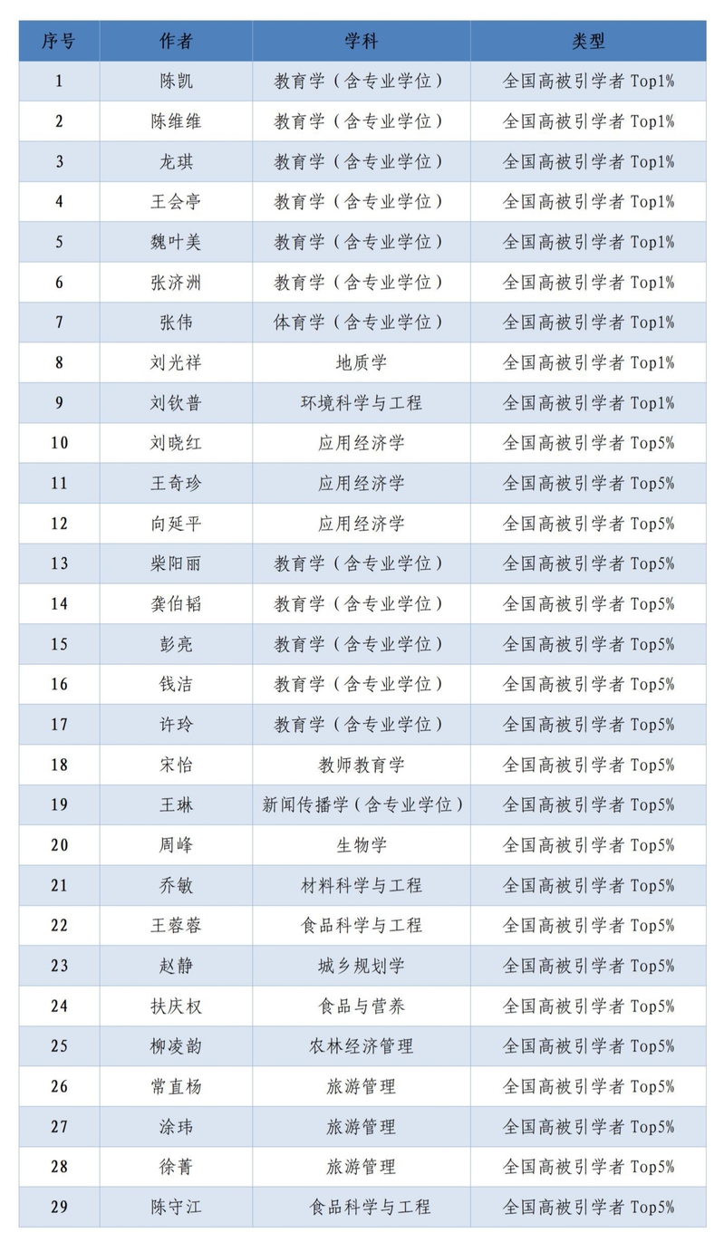 我校入选学者覆盖教育学、体育学、地质学、环境科学与工程等多个优势学科,其中教育学学科共有12位学者入选,彰显了学校的教师教育特色,体现了学校在学科建设领域的扎实成效与学术影响力的持续攀升。下一步,学校将持续深化与国内外高校及科研机构的合作交流,不断为学术研究创新和高层次人才培养注入新活力,全力推动科研水平再上新台阶。