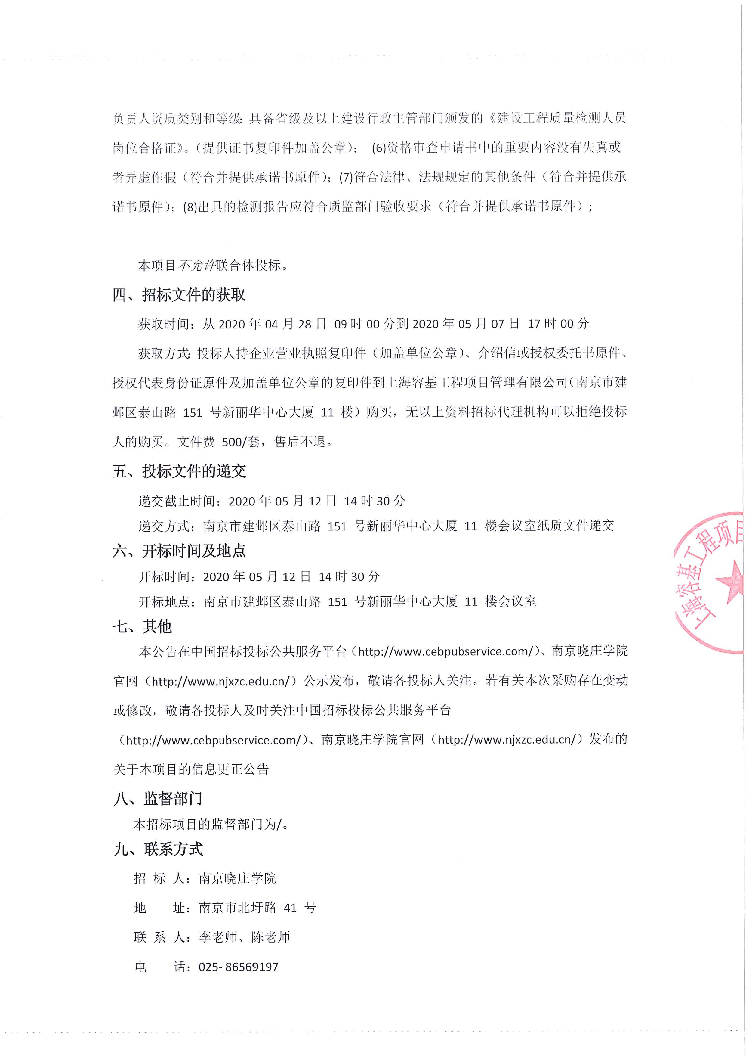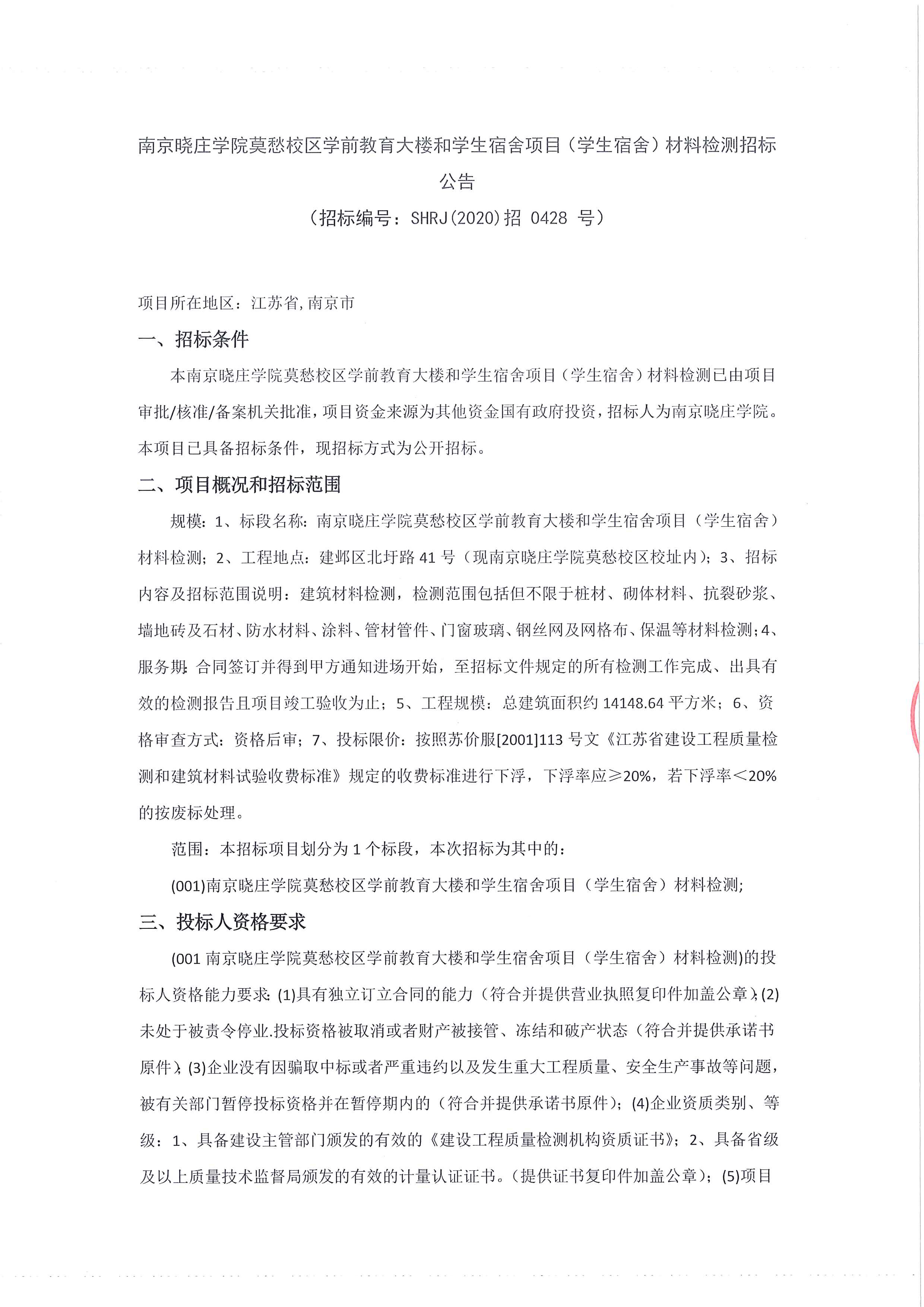 南京晓庄学院莫愁校区学前教育大楼和学生宿舍项目(学生宿舍)材料检测招标公告