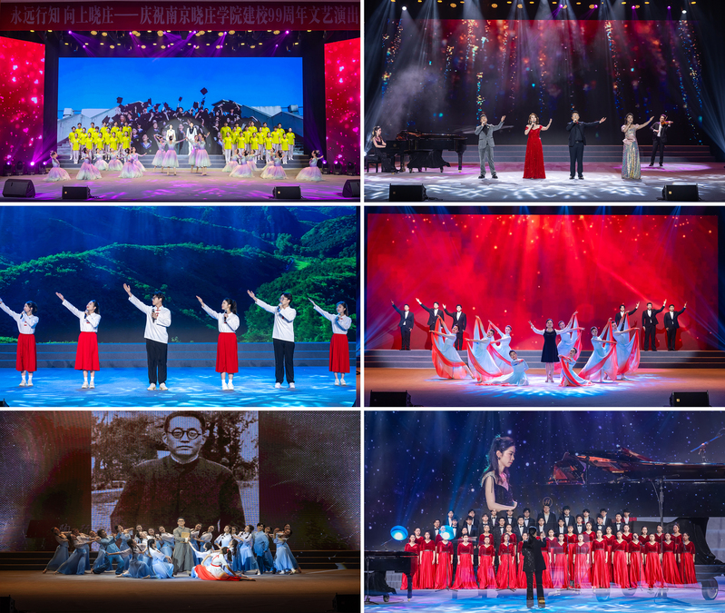 文艺演出由师生校友倾情演绎。歌舞《从春天出发》朝气蓬勃,文华奖获奖歌曲《是你一直想着我》深情动人,诗朗诵《信仰的力量》铿锵有力,音乐情景剧《假如我为了真理而牺牲》催人泪下,舞蹈《行知·之行》意蕴悠长,合唱《中国脊梁》气势磅礴,唱响家国担当;合唱《我行我知》坚定嘹亮,彰显晓庄品格。一个个节目串联起晓庄的红色记忆与精神传承,现场高潮迭起,掌声不断。