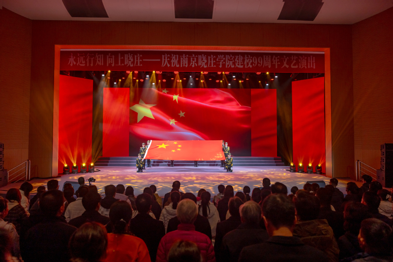 文艺演出在嘹亮的军号声中拉开帷幕,校国旗护卫队护卫着一面庄严的国旗步入会场。这面国旗曾于2024年3月15日晓庄建校97周年校庆日在天安门广场冉冉升起。全场师生高唱中华人民共和国国歌,庄严肃穆,激荡人心。