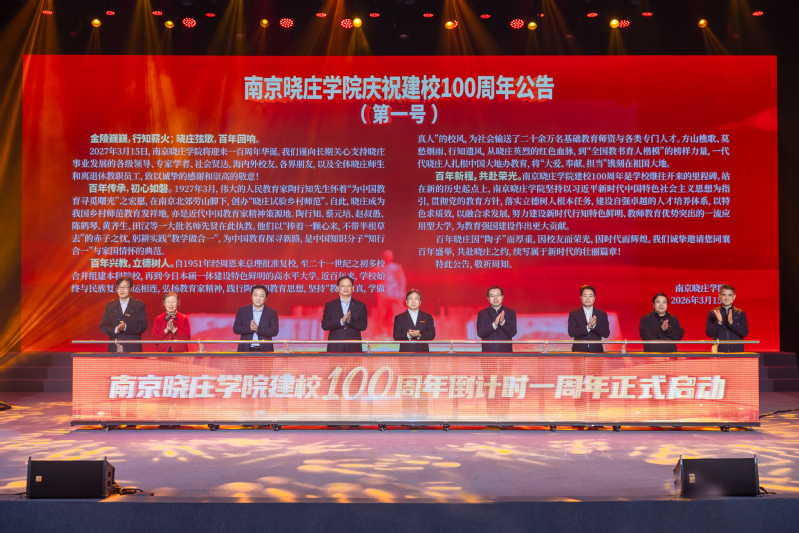 在全场热切期盼中,张策华、魏崇、潘东标、张志华、张宏伟、高琼、刘爽、杨瑞清和全国优秀教师袁宗金登台,共同启动南京晓庄学院建校100周年倒计时一周年仪式,同时学校“百年晓庄”专题网站同步上线,庆祝南京晓庄学院建校100周年第一号公告正式发布。全场掌声雷动,共同见证这一历史性时刻。
