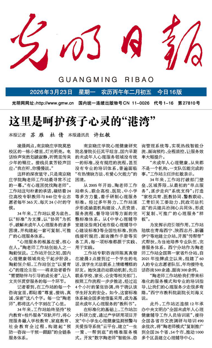 3月23日,《光明日报》08版教科新闻版专题刊发《这里是呵护孩子心灵的“港湾”》一文,深度报道南京晓庄学院陶老师工作站34年如一日守护未成年人心理健康、探索构建可复制可推广心理服务体系的实践与成效。文章呈现了学校以陶老师工作站为依托,在心理健康服务领域持续深耕的育人成果,让更多孩子在心灵成长路上拥有一个随时可以停靠的“港湾”。