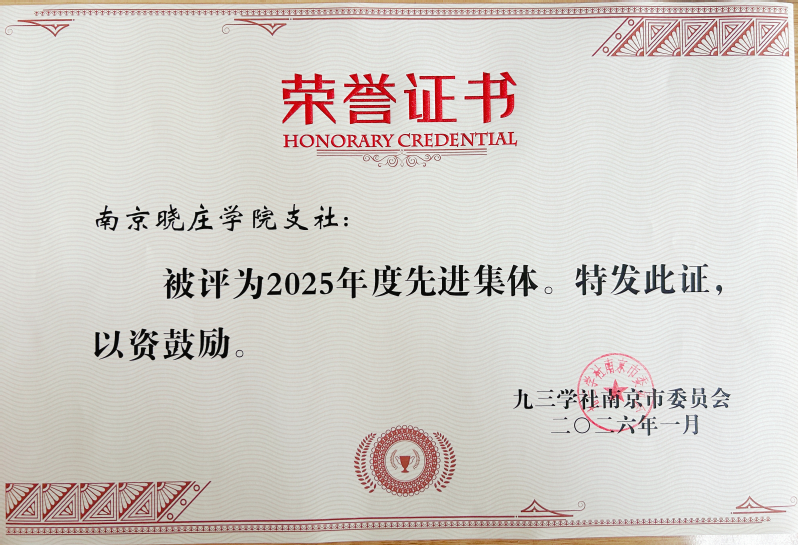 近日,九三学社南京市委员会公布2025年度先进集体与先进个人表彰决定,九三学社南京晓庄学院支社获评“2025...